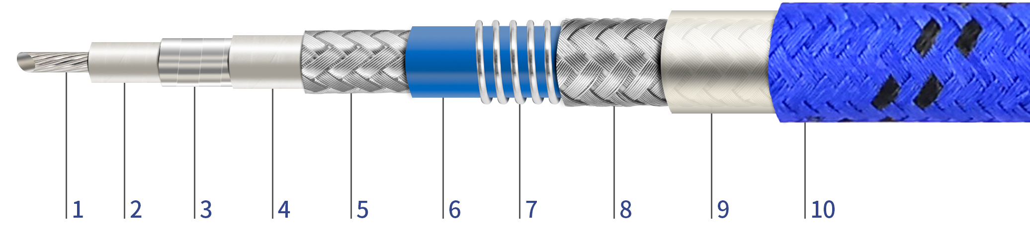 1.中心導體(ti)/銅鍍銀(單(dan)芯或多芯(xīn)) 2.介質層/低(di)密度PTFE 3.内層(céng)屏蔽/鍍銀(yín)銅帶繞包(bao) 4.中間層/PTFE包(bao)覆 5.外編織(zhi)層/鍍銀銅(tong)絲 6.外護套(tào)/藍色FEP 7.彈簧(huang)結構/不鏽(xiu)鋼絲 8.外編(bian)織層/鍍銀(yín)銅絲 9.防水(shui)層/聚酰亞(ya)胺+PTFE 10.外護套(tao)/藍色PTFE絲 |
