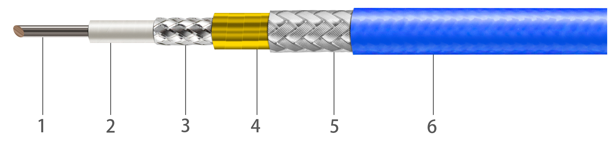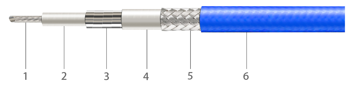 1.中心導體(tǐ)/銅鍍銀(單(dān)芯或多芯(xīn)) 2.介質層/低(dī)密度PTFE 3.内層(ceng)屏蔽/鍍銀(yin)銅帶繞包(bāo) 4.中間層/PTFE包(bao)覆 5.外編織(zhi)層/鍍銀銅(tóng)絲 6.外護套(tao)/藍色FEP |