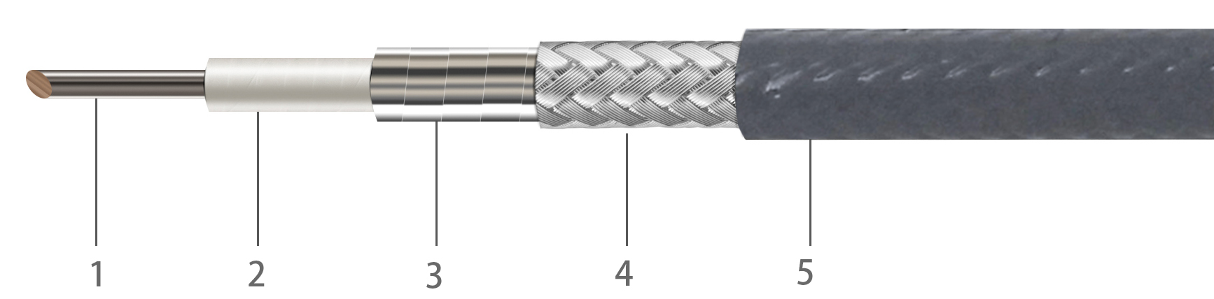 1.中(zhōng)心導體/銅(tóng)鍍銀(單芯(xin)) 2.介質層/低(di)密度PTFE 3.内層(céng)屏蔽/鍍銀(yín)銅帶繞包(bao) 4.外編織層(ceng)/鍍銀銅絲(si) 5.外護套/灰(huī)色PFA |