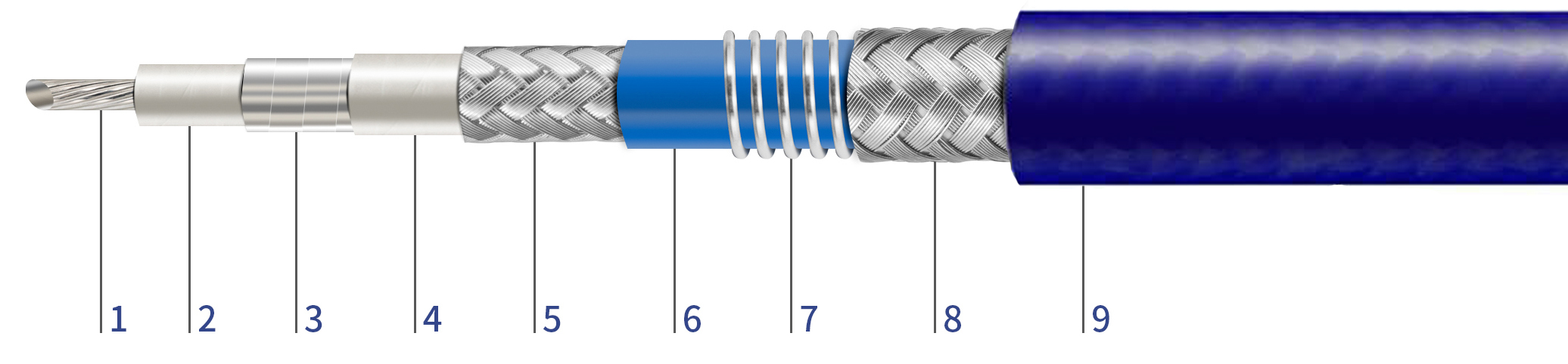 1.中心導(dǎo)體/銅鍍銀(yín)(單芯或多(duō)芯) 2.介質層(céng)/低密度PTFE 3.内(nèi)層屏蔽/鍍(dù)銀銅帶繞(rào)包 4.中間層(ceng)/PTFE包覆 5.外編(bian)織層/鍍銀(yin)銅絲 6.外護(hù)套/藍色FEP 7.彈(dàn)簧結構/不(bú)鏽鋼絲 8.外(wai)編織層/鍍(du)銀銅絲 9.外(wài)護套/藍色(se)PUR |